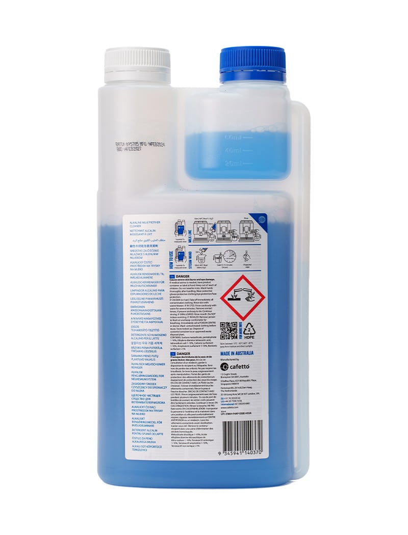 Cafetto MFC Blue is een alkalische melkreiniger, speciaal ontwikkeld voor het reinigen van automatische melkopschuimers en melksystemen in koffie- en espressomachines. Met zijn krachtige formule verwijdert deze reiniger effectief melkvetten en ontkalkt hij het systeem zonder geursporen achter te laten. De fles van 1 liter biedt een handige doseermethode, waardoor het eenvoudig is om de juiste hoeveelheid reiniger te gebruiken. Dit product is ideaal voor dagelijkse schoonmaakroutines, zodat je melksysteem optimaal blijft functioneren en de kwaliteit van je koffie behouden blijft.