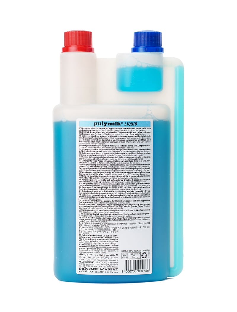 Puly Caff, gevestigd in Vescovato, Italië, staat bekend om zijn hoogwaardige reinigingsproducten voor koffiemachines en espressosystemen. De Milk Plus melkreiniger voldoet aan de hoogste kwaliteitsnormen en is NSF-gecertificeerd, wat betekent dat het veilig is voor alle machineonderdelen en geen schadelijke residuen achterlaat. De reiniger is speciaal ontworpen om snel op te lossen en melksystemen grondig schoon te maken zonder de smaak van je koffie te beïnvloeden. Met 1000 ml per fles heb je voldoende voor regelmatig onderhoud en langdurige prestaties.